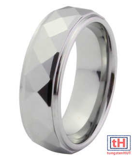 This 7mm wide diamond shape faceted ring uniquely and elegantly crafted. Known for its durability and strength, recently increasing in popularity. With a step edge and high finish polish this ring has a personality that you can’t find elsewhere.